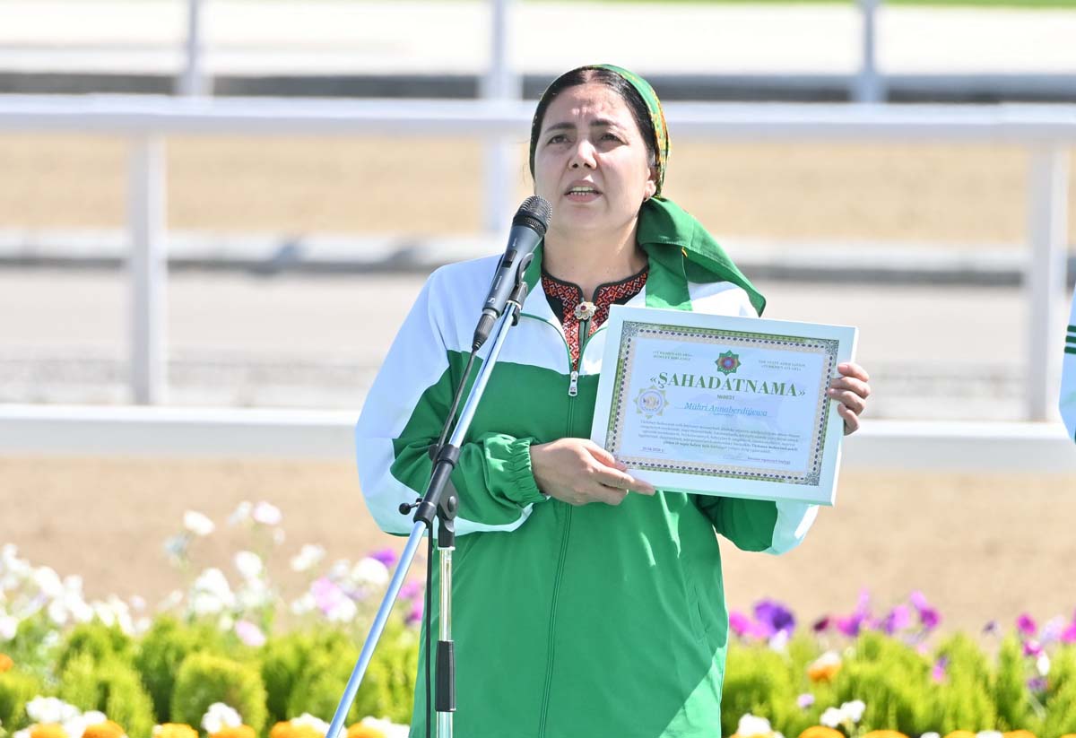 Затем состоялась церемония награждения победителей конного марафона и соревнований по конкуру, проведённых по случаю Национального праздника туркменского скакуна. В конном марафоне 1-го места удостоился скакун по имени Мелегуш, относящийся к хозяйству Б.Баллыева. В соревнованиях по конкуру победителем стал скакун Гудратлы, относящийся к Ахалтекинскому конному комплексу Президента Туркменистана. Победителям были вручены призы отраслевых ведомств страны.