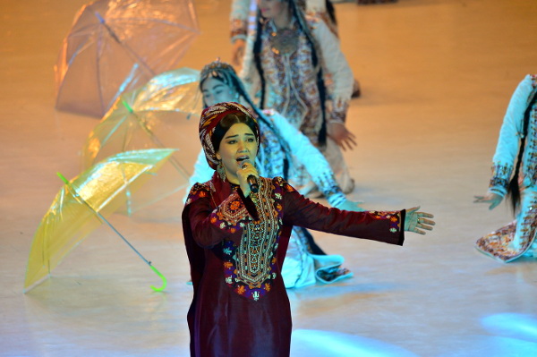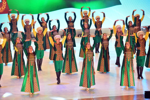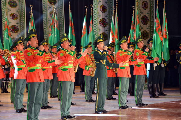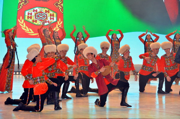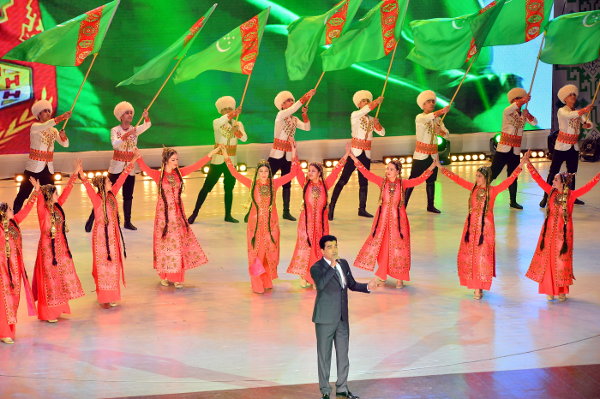 В столичном Дворце мукамов состоялся праздничный концерт в честь Дня Государственного флага Туркменистана. В торжествах в честь священного символа нации заложен мощный духовный посыл, он имеет большое значение в воспитании высокой гражданственности и патриотизма, что нашло отражение в увертюре праздничного действа – литературно-музыкальной патриотической композиции на основе видеоряда. На большом экране реет зеленый стяг Отчизны, отражаются знаковые события эпохи могущества и счастья – свидетельства многогранной деятельности Президента Гурбангулы Бердымухамедова. Её логическим продолжением стала яркая энергичная постановка, посвященная теме спорта, особенно актуальной в контексте девиза нынешнего года - Года здоровья и воодушевлённости и подготовки нашей страны к проведению Азиады-2017. Представление, с энтузиазмом исполненное детскими творческими коллективами, отразило нашу уверенность, что зелёный стяг Отчизны в качестве символа спортивных побед независимого Туркменистана ещё не раз будет поднят на самых крупных спортивных форумах планеты. Высокую тональность праздничного действа подчеркнуло выступление молодых воинов: солиста - победителя конкурса «Янлан, диярым!», а также участников песенно-музыкального коллектива «Мердана несиллер» Центрального дома офицеров Министерства обороны страны и военного оркестра «Гёрелдели». Программа концерта включила выступления известных музыкантов и исполнителей народных песен, популярных эстрадных певцов - победителей проводимых в нашей стране творческих конкурсов, фольклорных групп, прославленных хореографических ансамблей. В числе участников – самодеятельные творческие коллективы, созданные при вузах, министерствах и ведомствах и способствующие приобщению широких масс населения к национальной культуре и искусству, а также поиску новых талантов. Со сцены Дворца мукамов звучали мелодии народной и классической туркменской музыки, современные песни о Родине, любви и счастье. Традиционно в завершение концерта фольклорно-танцевальными группами велаятов страны был исполнен древний туркменский танец «куштдепди», олицетворяющий единство народа, его творческое вдохновение. Заключительным аккордом праздничного представления на сцене Дворца мукамов прозвучала песня, вдохновенные слова и патетическая музыка которой явились высоким гимном зелёному стягу Родины, отражением испытываемых миллионами граждан нашей страны высоких чувств гордости и счастья за независимый нейтральный Туркменистан, переживающий сегодня эпоху своего подлинного расцвета.
