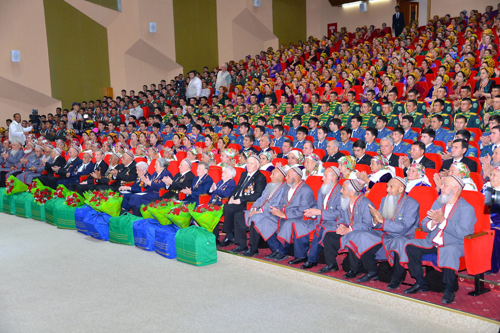 В столичном Дворце «Мекан» состоялась церемония чествования ветеранов и вдов воинов, которым от имени Президента Гурбангулы Бердымухамедова были вручены денежные и ценные подарки, прекрасные букеты весенних цветов. Организаторами торжественного мероприятия, посвящённого 72-й годовщине Великой Победы, выступили Совет старейшин, Министерство обороны и общественные организации страны, хякимлики столицы и велаятов. На церемонию были приглашены ветераны-фронтовики и солдатские вдовы, представители общественных организаций, военных и правоохранительных органов, высших учебных заведений, госслужащие, деятели культуры, студенческая молодёжь. Со сцены звучали слова глубокой признательности поколению 40-х за их беспримерный подвиг. Их стойкость и любовь к родной земле достойны уважения и всегда будут служить высоким нравственным ориентиром для молодого поколения. В своих выступлениях, ветераны и вдовы выразили признательность Президенту Гурбангулы Бердымухамедову за заботу и внимание к участникам войны и семьям павших воинов. Благодаря предоставленным по инициативе главы государства льготам созданы все условия для их достойной жизни. В торжественной обстановке ветеранам и вдовам героев были вручены памятные подарки и цветы. Затем своё мастерство и талант продемонстрировали лучшие музыкальные, фольклорные и танцевальные коллективы, известные солисты и молодые артисты, юные дарования. В концертную программу вошли песни военных лет, сочинения выдающихся туркменских композиторов и современных авторов, стихотворения известных поэтов страны. Сегодня церемонии чествования ветеранов войны и вдов павших воинов также прошли в государственных театрах велаятов. В День Победы – 9 мая – состоятся традиционные церемонии возложения цветов в Мемориальном комплексе «Halk hakydasy», к памятникам героев войны 1941-1945 годов в других городах страны. В этот день повсеместно будут организованы концерты, театрализованные представления, творческие акции и народные гуляния.