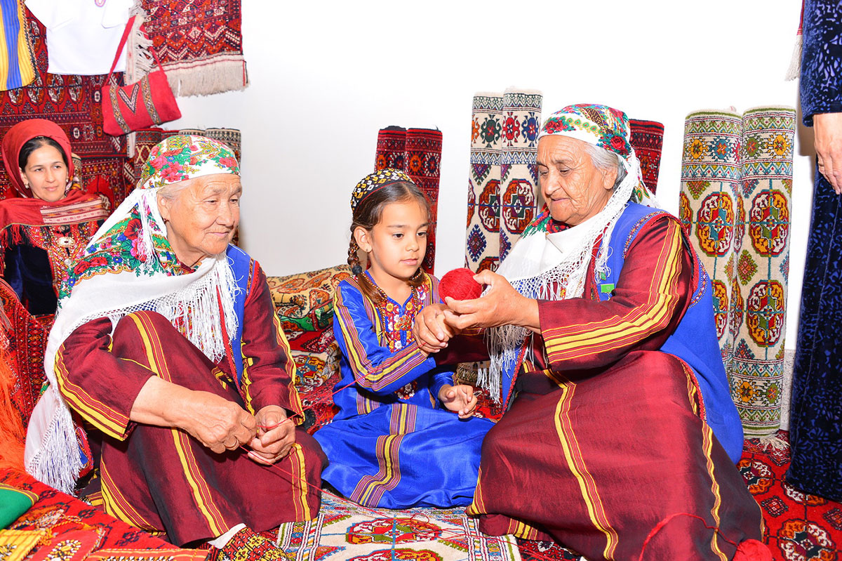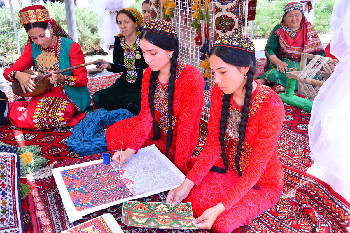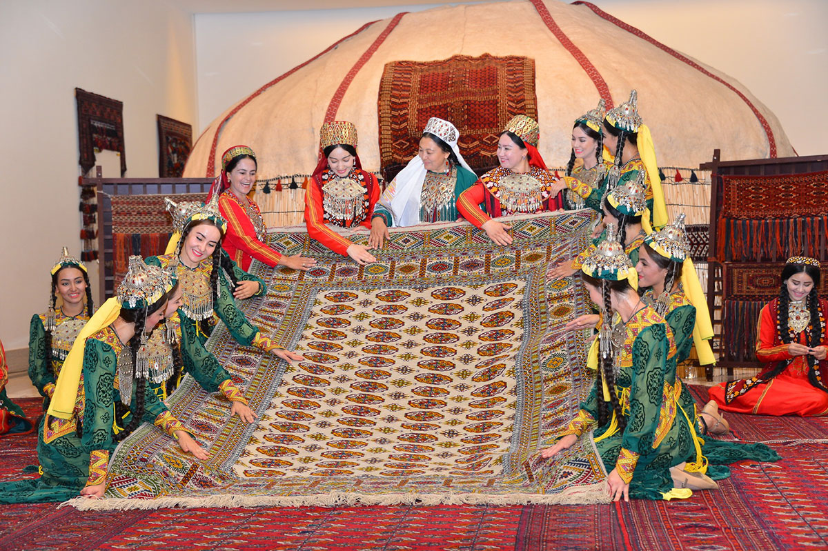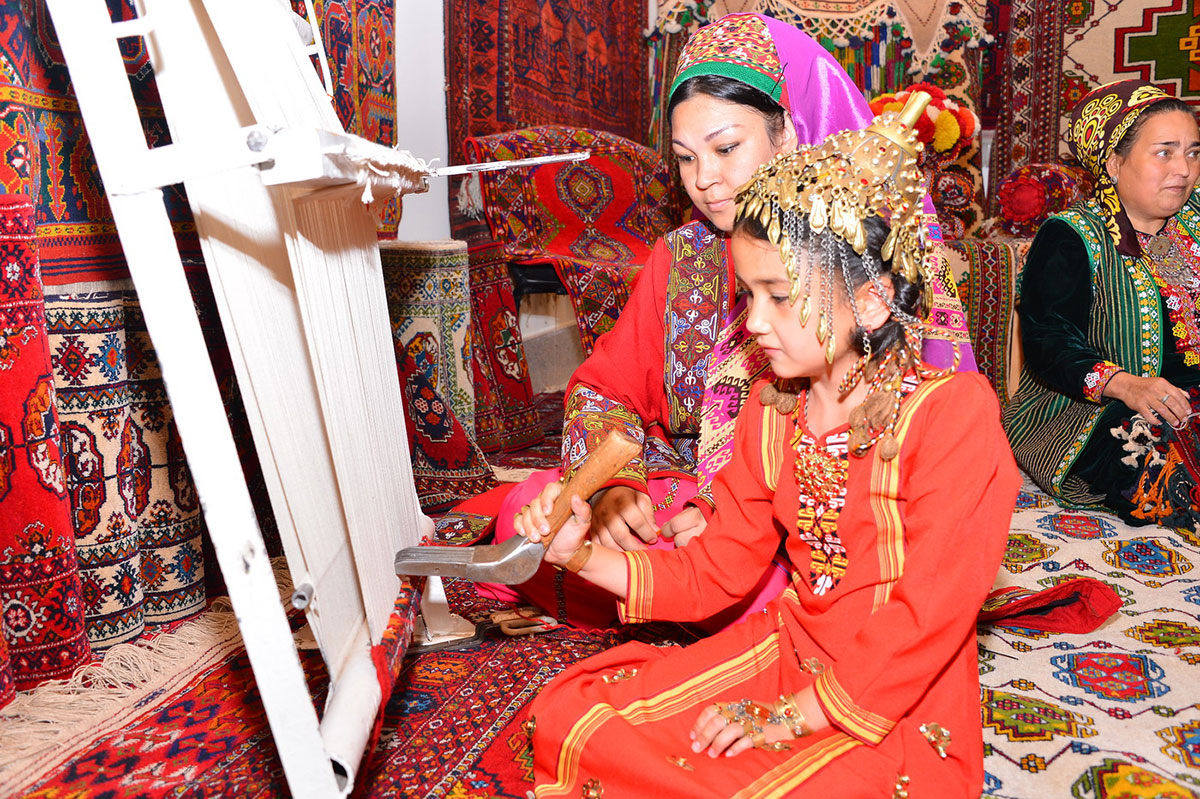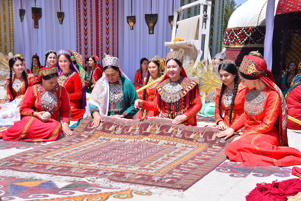 В Ашхабаде открылась международная ковровая выставка, организаторами которой выступили Государственное объединение «Туркменхалы» и Торгово-промышленная палата Туркменистана. Экспозиция, развернутая в залах Национального музея туркменского ковра и на красочно убранных площадках прилегающей к нему территории, - одно из ярких мероприятий, приуроченных к Празднику туркменского ковра. Залы одного из самых уникальных музейных комплексов не только нашей страны, но и мира хранят около 2000 бесценных древних раритетов и современных шедевров национального коврового достояния. Музей стал самой посещаемой историко-культурной достопримечательностью столицы, привлекая все большее число почитателей туркменского ковра – ученых-исследователей, экспертов, коллекционеров и туристов. Для участия в нынешнем форуме в Ашхабад прибыли делегации из 14 государств Европы и Азии, в том числе из России, Германии, Великобритании, Турции, Саудовской Аравии, Объединенных Арабских Эмиратов, Ирана, Пакистана, Афганистана, а также Азербайджана, Казахстана, Узбекистана, Таджикистана. Среди 175 зарубежных гостей – руководители и специалисты, представляющие научно-культурные центры и крупные ковровые, торговые компании. В числе гостей – делегаты Всемирной ассоциации ценителей туркменского ручного ковроделия, Гуманитарной ассоциации туркмен мира. В церемонии открытия смотра приняли участие члены правительства, руководители Меджлиса, министерств и ведомств, главы аккредитованных в Туркменистане дипломатических миссий, деятели культуры и искусства, студенческая молодежь, а также представители СМИ, общественных организаций, отраслевых предприятий и знатные ковровщицы из всех велаятов страны. Гостям была предоставлена возможность окунуться в атмосферу туркменского тоя с присущими ему традициями, песнями бахши, развернутыми на площадках экспозиции театрализованными представлениями. Уникальные экспонаты, в числе которых – украшенные вышивкой женские наряды, ювелирные изделия, великолепные шерстяные и шелковые ковры – воссоздавали удивительную картину богатейшего духовно-культурного наследия туркмен. Не скрывая своего восторга, посетители спешили запечатлеть на камеру изумительной работы классические орнаментальные чистошерстяные и шелковые ковры, пейзажные панно, великолепные сюжетные картины. Каждый уголок импровизированного села, раскинувшегося за пределами выставочных залов музея, передавал колоритную картину кропотливого труда ковровщиц, последовательную цепочку традиционных ещё в недалеком прошлом операций в подготовке к работе над будущим ковром. Во всем многообразии здесь представлены процессы подготовки и окрашивания пряжи, изготовления цветных кошм, предметов национальной одежды, вышивки и других видов рукоделья. Посетители с искренним интересом наблюдали, как молодые женщины и девушки, напевая народные песни, создавали новые образцы рукодельного искусства. Большой коллекцией сувенирных изделий привлекли посетителей и туркменские предпринимательницы. Сегодня они вносят весомый вклад в развитие ковровой и туристической индустрии. В их искусстве нашла отражение и тема предстоящих в Ашхабаде в сентябре этого года V Азиатских игр в закрытых помещениях и по боевым искусствам. Рукотворные шедевры мастериц станут 