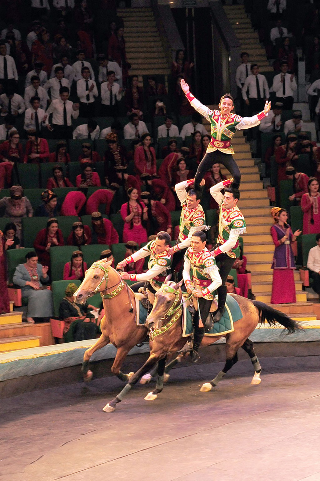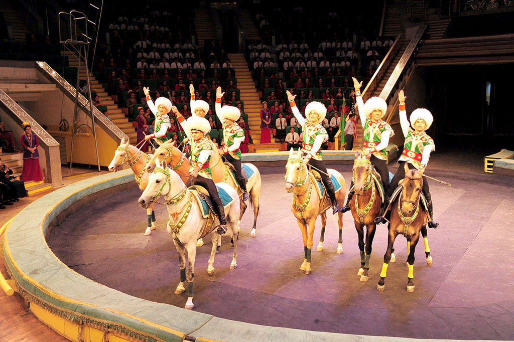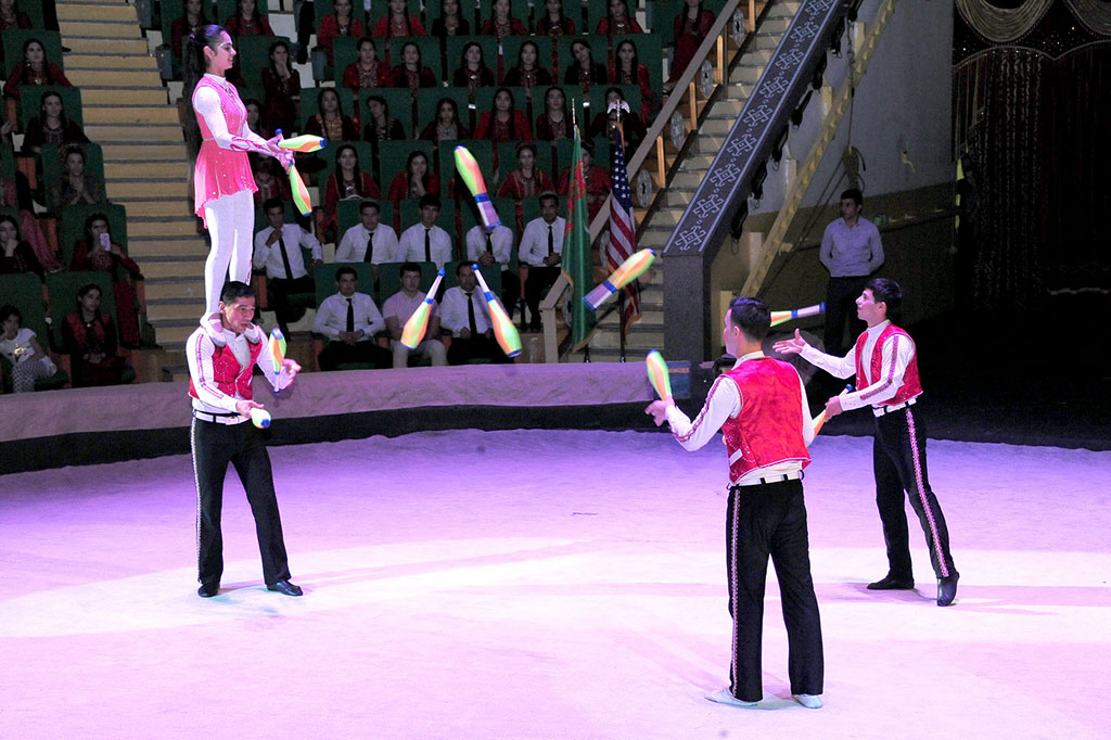 Под сводами Государственного цирка состоялось представление туркменских и американских артистов. В состав американской делегации вошли преподаватели и тренеры, которые также успешно продолжают свою деятельность на цирковой арене. Так, воздушная гимнастка Сара Доул, гастролирующая в разных странах, передаёт секреты своего мастерства, являясь сертифицированным инструктором программы цирковой подготовки тренеров во всемирно известном Цирке дю Солей. Уильям «Билл» Форчон – клоун, мим, кинорежиссёр занимается педагогической деятельностью в специальных учебных заведениях США и Англии, а также в Цирке для детей. Его коллега клоун, режиссёр, актёр и основатель собственного театра Билли Хиггинс сочетает выступления с активной тренерской и преподавательской работой за рубежом. Как отметил, характеризуя культурную акцию, Чрезвычайный и Полномочный Посол Соединенных Штатов Америки в Туркменистане Аллан Мастард, у наших стран – богатая история циркового искусства. Нас объединяет приверженность его замечательным традициям. На арене были представлены практически все жанры. Зрители рукоплескали выступлениям воздушных гимнастов, ловкости канатоходцев, виртуозам-акробатам, умелым жонглёрам. Дружными аплодисментами зал наградил весёлых американских клоунов, выразивших на языке пантомимы доброе расположение к туркменистанцам. «Гвоздём» программы традиционно явилась знаменитая джигитовка на ахалтекинских скакунах. Зрителей заворожила красота и стремительность «царских коней», лихость наездников, выполняющих на полном скаку трюки и разнообразные приёмы джигитовки, доставшиеся туркменским артистам в наследство от талантливых предков. Завершилось цирковое шоу древним обрядовым танцем куштдепди. На арену цирка вышли все участники яркого празднества дружбы, вновь продемонстрировавшего созидательную силу искусства. В ходе представления наряду с отечественными артистами и американскими гостями, таланты демонстрировали начинающие циркачи – студенты Туркменского государственного института культуры. Именно им – наследникам лучших традиций отечественного циркового искусства предстоит ещё выше поднять престиж туркменского цирка. Программа пребывания американских гостей в Ашхабаде включила знакомство с цирковым искусством Туркменистана, опытом артистов и их программами, сотрудничество в методической сфере, практические занятия в Государственном цирке и мастер-классы для студентов циркового отделения Туркменского государственного института культуры. В ходе встреч педагогов и специалистов двух стран обсуждались вопросы эволюции мирового циркового искусства, его взаимодействия с другими видами творчества и месте в индустрии развлечений. Участники встреч выразили заинтересованность во взаимодействии в области повышения квалификации цирковых артистов, педагогов и тренеров. Цирк занимает свою нишу в палитре культурной жизни страны, на его арене блистают туркменские наездники, рождаются артистические династии, при аншлаге проходят выступления национальной труппы и многочисленных зарубежных. Пропагандистами наследия нации через цирковое искусство стали известные коллективы национальных конноспортивных игр «Галкыныш» и «Туркмен джигитлери», завоевавшие за последние годы немало призов всемирных цир