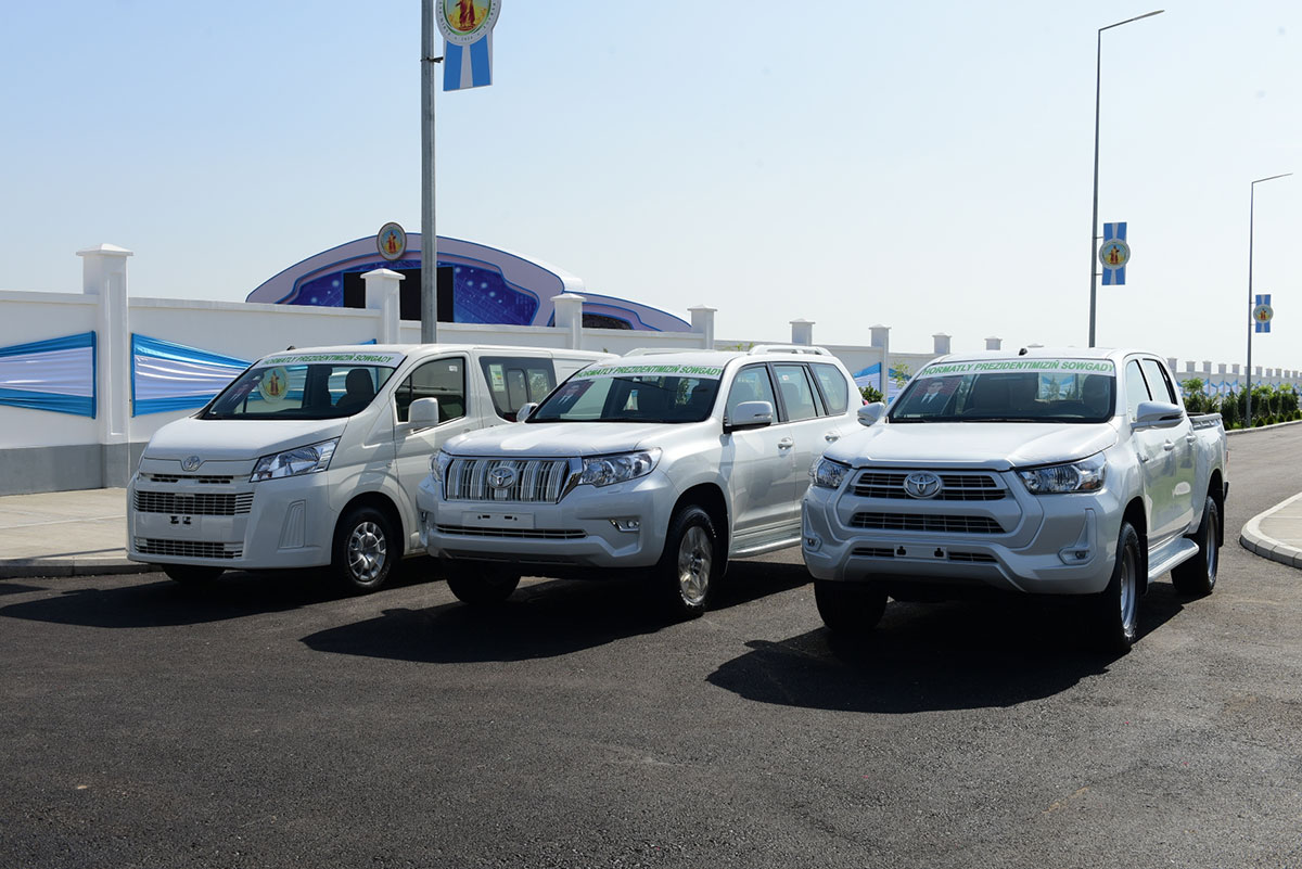 Hormatly Prezidentimiz desganyň edara binasyndan çykyp, pudak üçin niýetlenen täze awtoulaglaryň açarlaryny gowşurdy.