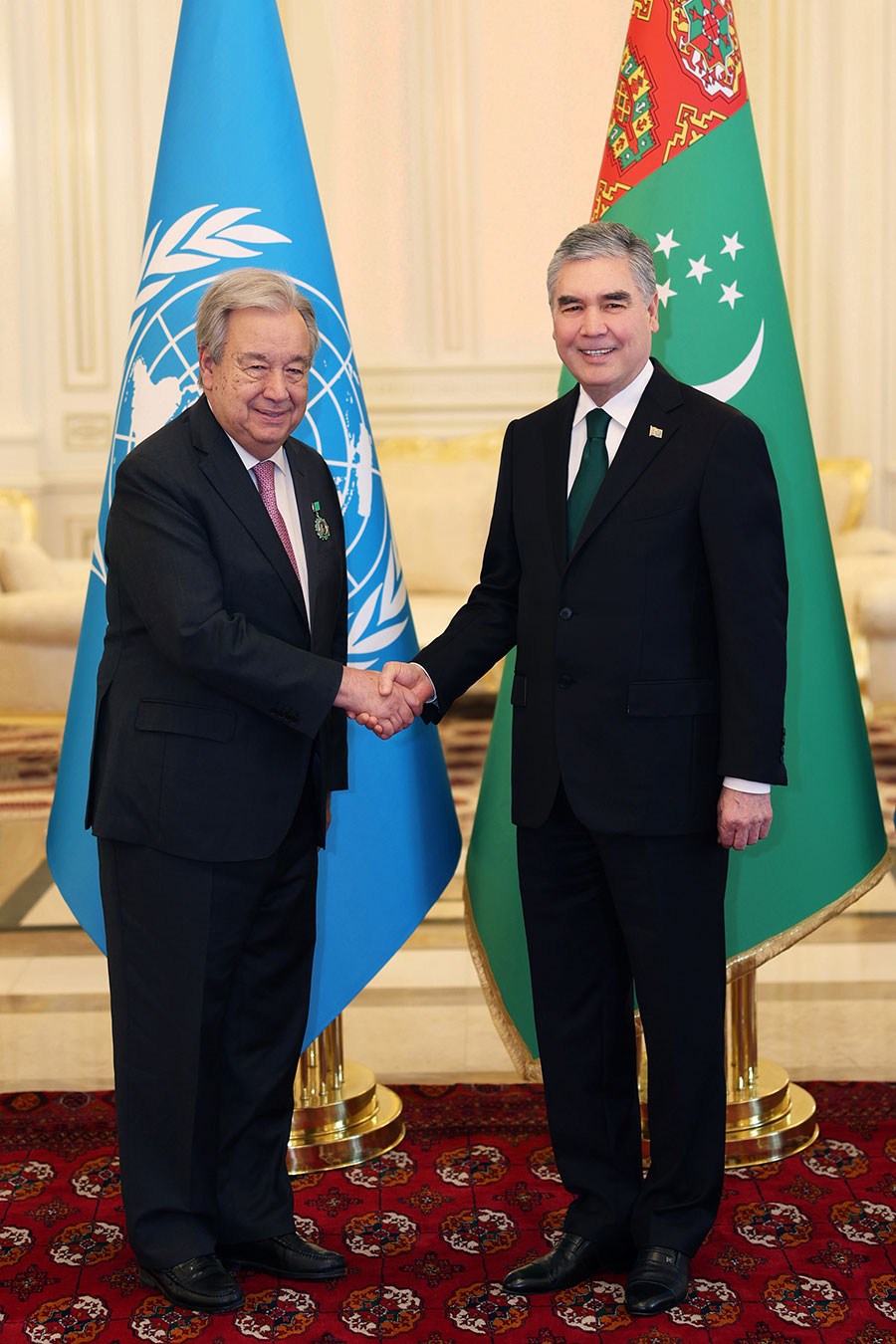 Türkmen halkynyň Milli Lideri Gurbanguly Berdimuhamedow belent mertebeli myhmany we onuň ýolbaşçylygyndaky wekiliýetiň agzalaryny mübärekläp, Türkmenistana gelmäge çakylygy kabul edendikleri üçin minnetdarlyk bildirdi hem-de BMG-niň Baş sekretary bilen ozalky duşuşyklaryny ýakymly duýgular bilen ýatlaýandygyny aýtdy. Olaryň dowamynda möhüm meseleler ara alnyp maslahatlaşyldy. Şeýle gatnaşyklaryň hemişe netijeli, birek-birege hormat goýmak häsiýetine eýe bolandygy bellenildi. Bu dialogyň dowamynda Türkmenistanyň we BMG-niň uzak möhletleýin hyzmatdaşlyk strategiýasynyň esasy ugurlary kesgitlenildi, ony durmuşa geçirmegiň görnüşleridir gurallary işlenip taýýarlanyldy hem-de kämilleşdirildi.