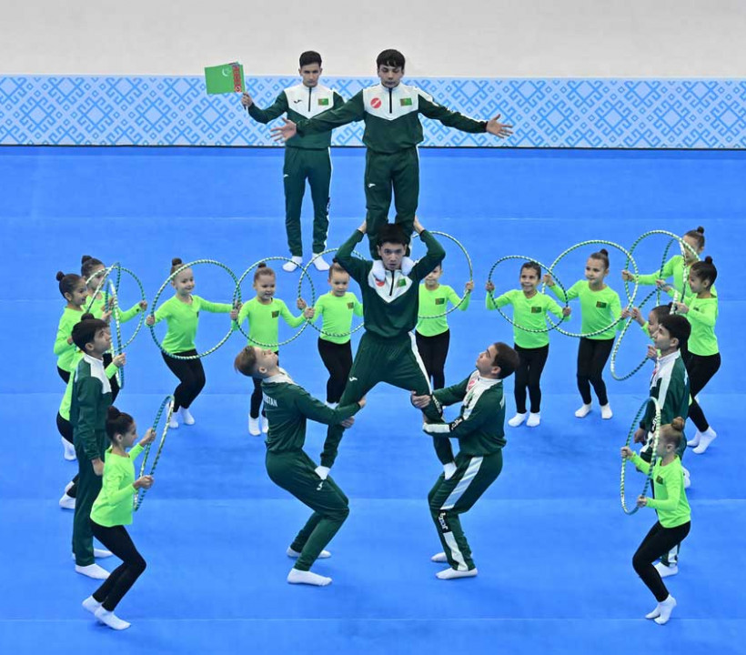 Türkmenistanyň Döwlet senasy ýaňlanýar. Dabara gatnaşyjylaryň agzybirlikde Döwlet senasyny ýerine ýetirmekleri bilen, Döwlet baýdagy galdyrylýar. Watanymyzda köpçülikleýin bedenterbiýe-sport hereketiniň toplumlaýyn esasda ösdürilýändigi we sagdyn durmuş ýörelgeleriniň barha ýaýbaňlandyrylýandygy, ýaşlaryň zehinini açmak ugrunda uly tagallalaryň edilýändigi üçin hormatly Prezidentimize tüýs ýürekden çykýan hoşallyk sözleri beýan edilýär.