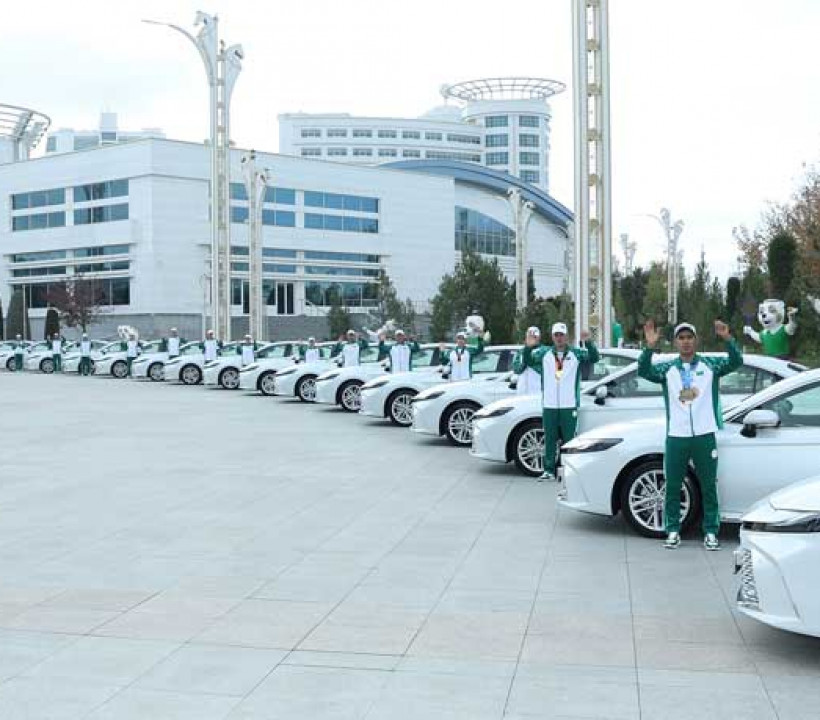 Soňra döwlet Baştutanymyz dünýä derejeli ýaryşlarda altyn medala mynasyp bolan türgenleri sylaglady. Arkadagly Gahryman Serdarymyz olaryň her birine 2025-nji ýylda goýberilen, ak reňkli «Toyota Camry HEV 2.5L» kysymly ýeňil awtoulagyň açaryny gowşurdy. Bu türgenler abraýly halkara ýaryşlarda hormat münberiniň iň ýokary basgançagyna çykyp, ýurdumyzyň ýaşyl tuguny belende galdyrmagy başardylar. Hormatly Prezidentimiz halkara ýaryşlarda altyn medala mynasyp bolan türgenleri taýýarlan tälimçilere-de 2025-nji ýylda goýberilen, ak reňkli «Toyota Camry HEV 2.5L» kysymly ýeňil awtoulagyň açaryny gowşurdy.