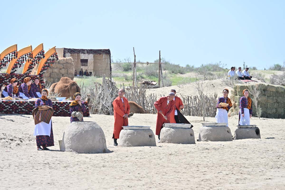 Döwlet Baştutanymyz ýokary tizlikli awtomobil ýolunyň Mary — Türkmenabat böleginiň ugrunda guralan dabara meýdançasynda toý däp-dessurlarymyzy we milli mirasymyzy açyp görkezýän edebi çykyşlary synlady. Hatara düzülen ak öýleriň ýanynda gazanlar atarylyp, olarda milli tagamlar taýýarlanylýar.